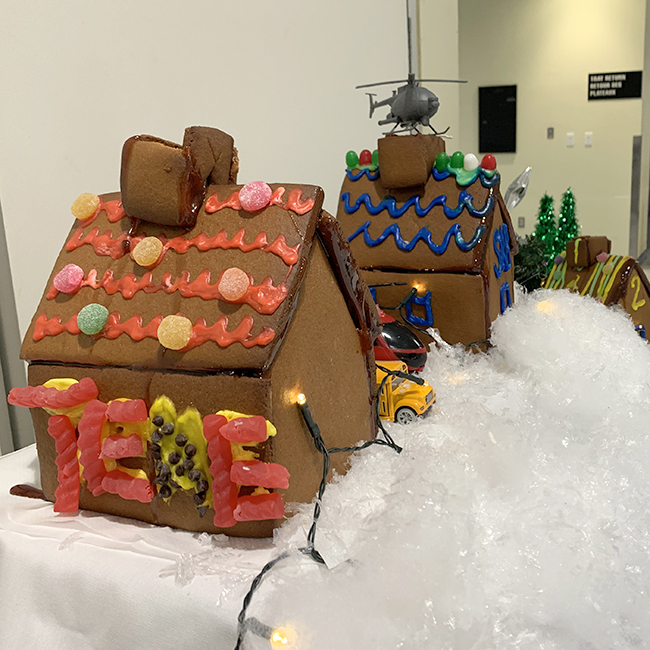 Down the snowy hillside, keep your eyes peeled for SAR-Tech gummy bears dangling from a rope overtop a gingerbread house roof. There’s a helicopter sitting atop a nearby house’s gingerbread chimney. A fire truck sits beside structure fire: flames are coming out underneath the gingerbread eaves. Candy bits spell out the names and signs and hangar numbers on the other gingerbread buildings in the scene, with frosted gingerbread trees set all around.