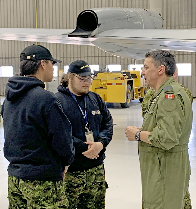 At 14 Wing, the CAFIEP group, about a dozen, including participants and staff; were welcomed at 404 (Long Range Patrol and Training) Squadron by 404 Squadron Deputy Commanding Officer Keith Tagg and 14 Operations Support Squadron Corporal Nicholas Whaley, the military co-chair of the wing’s Defence Indigenous Advisory Group.