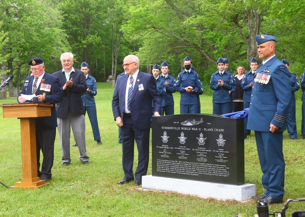 The ceremony included the national anthems of Canada, Australia and New Zealand, and a welcome from Gary Nelson, vice-president of the historical society. A number of wreaths were laid, including one by Susan Nelson from New Zealand and crash eyewitness Doris Dodge, in honour of Cowie; Amelia Branson from New Zealand in honour of Griffiths, and members of the Loucks family. The Pennfield Parish Military Historical Society, New Brunswick, also presented a wreath.