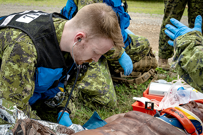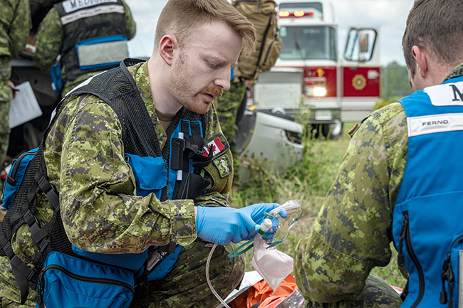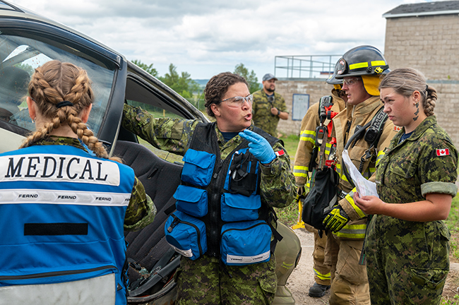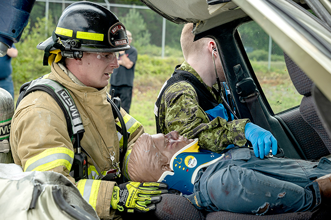 14 Wing Greenwood firefighters and medical technicians teamed up for a second round of Summer’23 joint training August 17, setting up and working through a number of vehicle debris and victim rescue and treatment scenarios in the base’s fire training area. Personnel from 14 Fire and Emergency Services and 26 Canadian Forces Health Services prepared the complex training opportunities for their members, testing response, procedures and scene management skills.