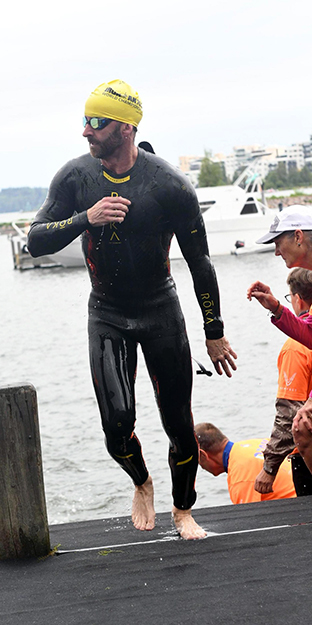 My sleep in Finland was poor (on average three to five hours per night), and the eve of race day was no exception: I went to bed early, but mentally ran through my race, transition zone routes, equipment…. Four a.m. came early, and I got up to “Finnish” preparations. The temperature was cool, so I bundled up and spent minimal time finalizing my T1 zone before finding an indoor spot to wait until my 9:10 a.m. start.