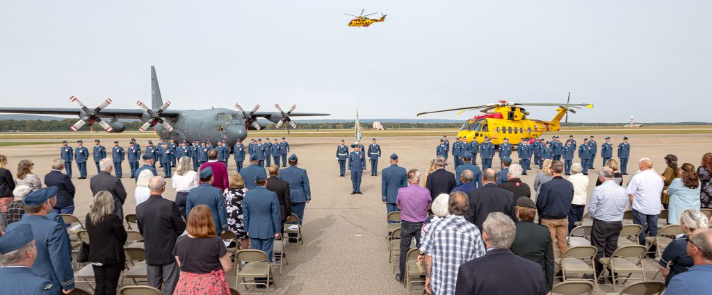 All gathered on the 14 Wing Greenwood parade square to remember the 25th anniversary of the loss of Labrador 305 in Marsoui, Quebec, October 2, 1998. Pilots Captain Peter Musselman and Captain Darrin Vandenbilche, flight engineers Master Corporal David Gaetz and Master Corporal Glen Sinclair, and search and rescue technicians Sergeant Jean Roy and Master Corporal Darrell Cronin were killed after an on-board fuel leak, fire and explosion, an off-balance rotor catching the main body and then in-air break up and crash. They were coming home after a medical call, accompanied on the first leg by peers aboard a squadron Hercules: those same peers were the first to arrive at the heart-breaking scene.