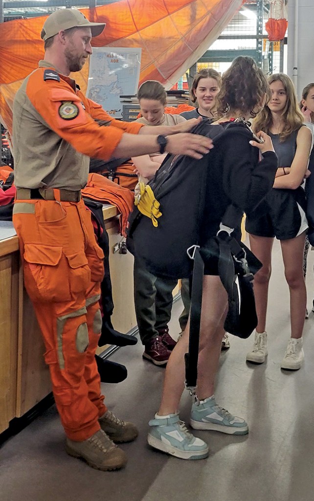 In the morning, excited teenagers climbed the many floors up to the air traffic control tower’s observation deck, stopping along the way to learn about the ATCT’s training and simulations capabilities. Students had a tour of 413 (Transport and Rescue) Squadron, where they learned about all the different equipment required for a search and rescue mission. The group also had the opportunity to walk through static displays of both the CH149 Cormorant helicopter and the CC130 Hercules plane, before gathering outside the hangar for a parachuting demonstration. The students were also put to work: one student, assisted by SAR technician Warrant Officer Fernando Bianco, radioed the aircraft to notify the crew the drop zone party was in position; after the demo, a team of volunteers joined the SAR-Techs to help bundle the parachutes. The group finished its tour at 14 Air Maintenance Squadron, where students learned about aircraft maintenance and Greenwood’s CP140 Aurora community. The wing’s mission to provide a memorable experience for the visiting youth was a success, as one teen commented the 14 Wing tour was her favorite stop during the week-long visit.
