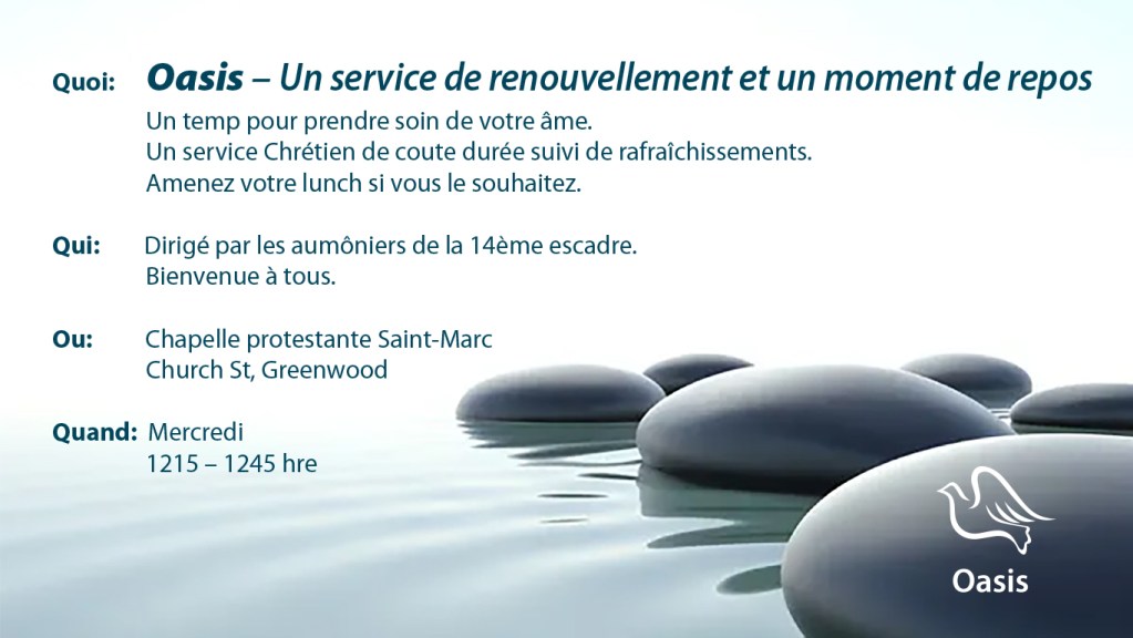 If you would enjoy a mid-week, mid-day Christian service, the 14 Wing Greenwood Protestant chaplains offer a Wednesday gathering they are calling “Oasis – A Service of Rest and Renewal.” While the short service will retain some traditional and liturgical elements, the intent is that it will also be less formal, more relaxed and personal. For example, those attending will gather in a circle in couches and chairs, instead of using standard pews. While it is religious in nature, Oasis may also be experienced and understood as a mid-week time for self-care: nurture your mind and soul.