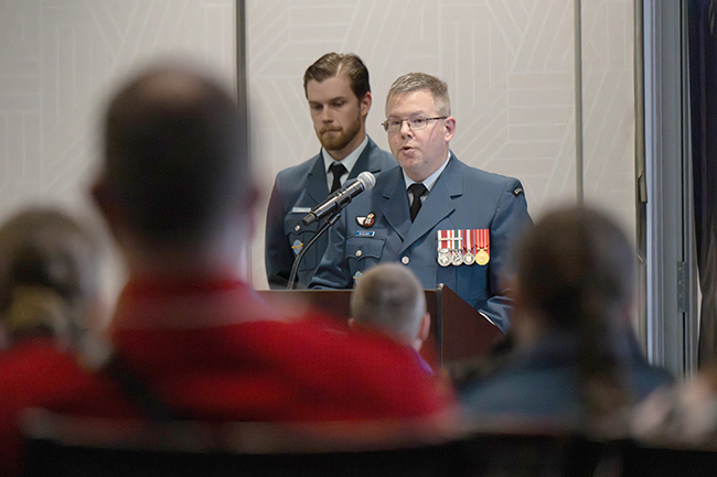 The event was hosted by the wing’s 413 (Transport and Rescue) Squadron in the Annapolis Mess, with heritage artefacts and artwork on display from the Greenwood Military Aviation Museum. A number of regional Royal Canadian Legion branches, the Air Force Association, Annapolis Valley First Nation, the RCMP and Cadets were represented in the audience, and during the wreath-laying. 14 Wing Greenwood piper Master Corporal Spencer Campbell and Bridgewater Fire Department Band bugler Lauran Allen provided the music.