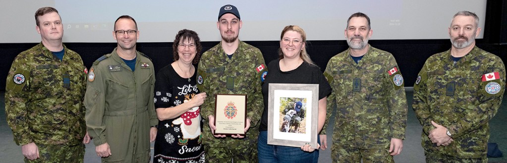 14 Operations Support Squadron Aviator Colin Carroll won the Military Community Life category, presented at a squadron gathering December 20 by 14 Wing Colonel Luc Vachon, along with a Wing Commander’s Commendation.