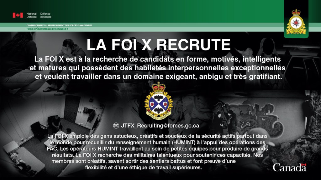 Joint Task Force X is home to the CAF’s Human Intelligence (HUMINT) capabilities and employs highly motivated individuals to conduct specialized intelligence activities across the spectrum of conflict. JTF X is seeking members with a high degree of maturity, curiosity, people skills and the desire to work in a specialized and small team environment. Ideal candidates are physically and mentally fit, adaptive, intelligent and display an ability to thrive in ambiguous environments. JTF X will be hosting recruiting activities at The Chamber, Birchall Centre, March 4, 11 a.m. to noon and 3 p.m. to 4 p.m. Come out and engage with unit members to explore the possibilities of a career in HUMINT.