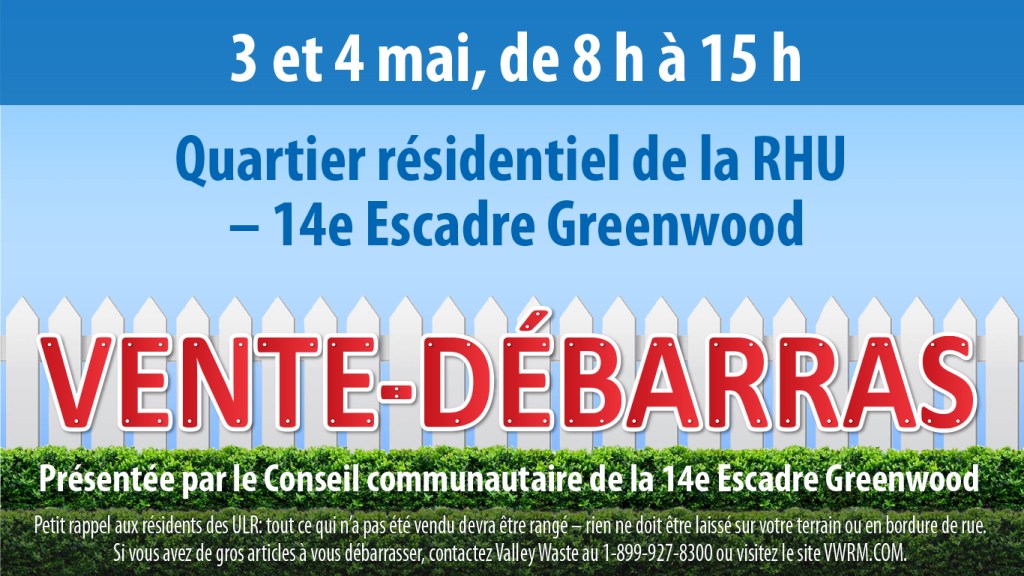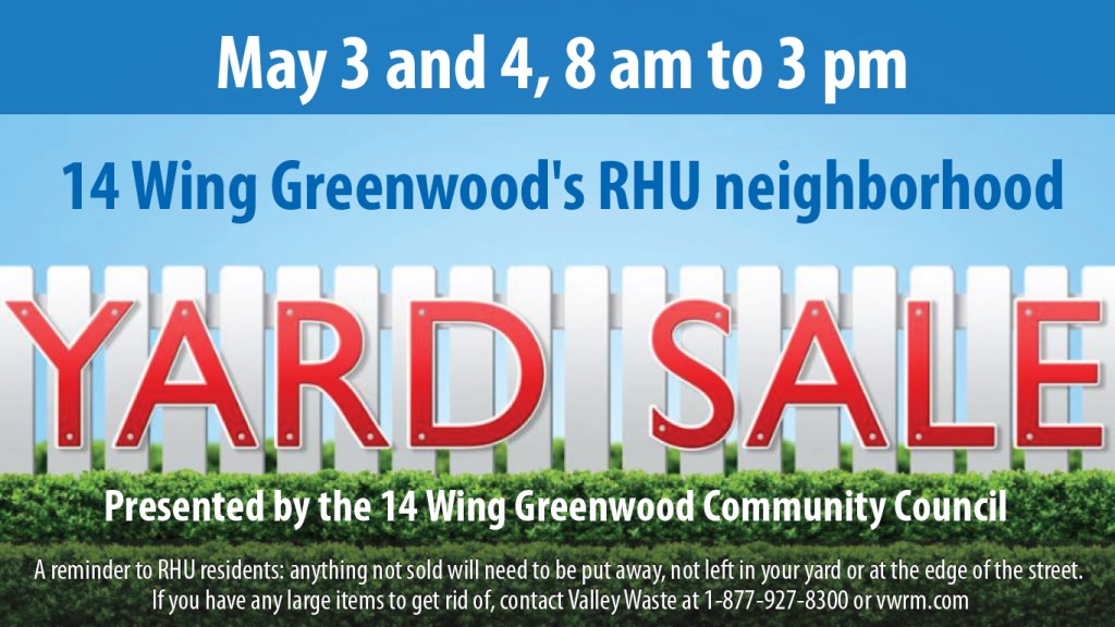 Saturday, May 3, and Sunday, May 4, the wing’s 500 RHUs’ residents are encouraged to join in the annual 14 Wing Community Council yard sale, both days, between 8 a.m. and 3 p.m. Be sure to keep your yard sale in your own yard, and a reminder this is the only approved weekend to sell your stuff in the RHU neighbourhood through the spring and summer months.