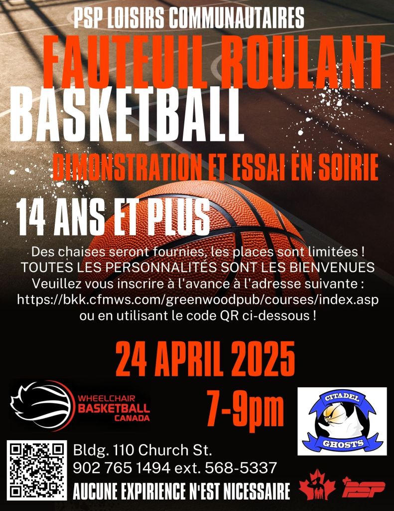 Wheelchair basketball try-it – April 24, 7 p.m. to 9 p.m., free wheelchair basketball demo and try-it (chairs provided). Ages 14+, all abilities welcome, no experience necessary. Pre-registration required.