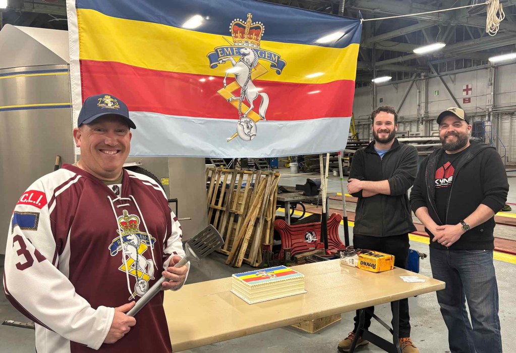 14 Wing Greenwood’s “hard Army” personnel – members of the Royal Canadian Corps of Electrical Mechanical Engineers – marked their unit’s 81st birthday May 23, BBQing in a barrel and making do at a cake-cutting with a massive metal spatula.