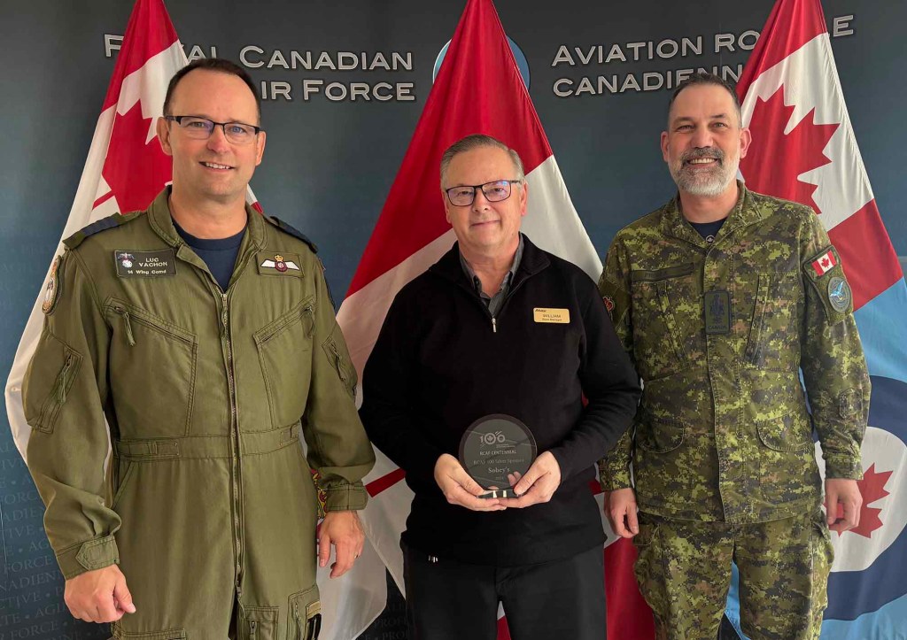 14 Wing presented sponsor appreciation plaques and goodie baskets – with RCAF100 swag and specialty 14 Wing items, to EXIT Realty Town & Country (platinum), Sobey’s Greenwood (silver), ReMax Banner Real Estate Greenwood (silver), Michael Bishop Accounting (silver) and Nathanson Seaman Watts (silver). McDonalds Greenwood and IMP Aerospace were recognized for their gold-level sponsorship with later presentations.