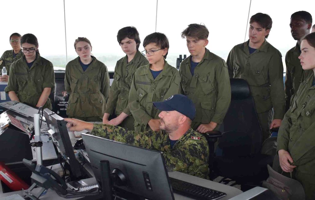 In addition to climbing the many steps of the air traffic control tower to get a bird’s eye view of the wing from the cab and visiting 413 (Transport and Rescue) Squadron’s search and rescue technician’s shop to learn about the different types of equipment SAR-Techs use on missions, Cadets also visited 14 Air Maintenance Squadron’s various repair sections – even the inside of an engine-testing bay, a stop that particularly suited Flight Sergeant Camden Wadden.