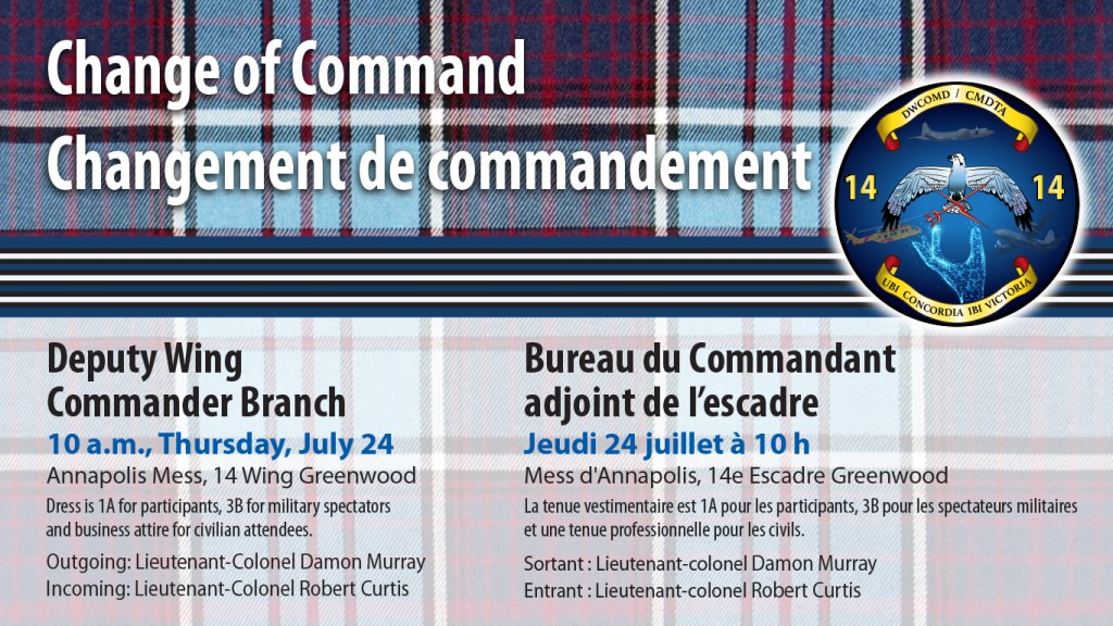Thursday, July 24, Deputy Wing Commander Branch will mark a change of command, as Lieutenant-Colonel Damon Murray is replaced by Lieutenant-Colonel Robert Curtis. The ceremony will take place at 10 a.m. in the Annapolis Mess, 14 Wing Greenwood. Dress is 1A for participants, 3B for military spectators and business attire for civilian attendees.