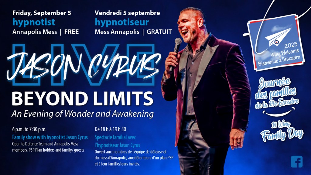 Prepare to be amazed! 14 Wing Greenwood’s Wing Welcome weekend includes a free, family-friendly evening show with hypnotist Jason Cyrus Friday, September 5, between 6 p.m. and 8 p.m. at the Annapolis Mess. The show is open to 14 Wing Defence team members and their families, Annapolis Mess members and their guests.