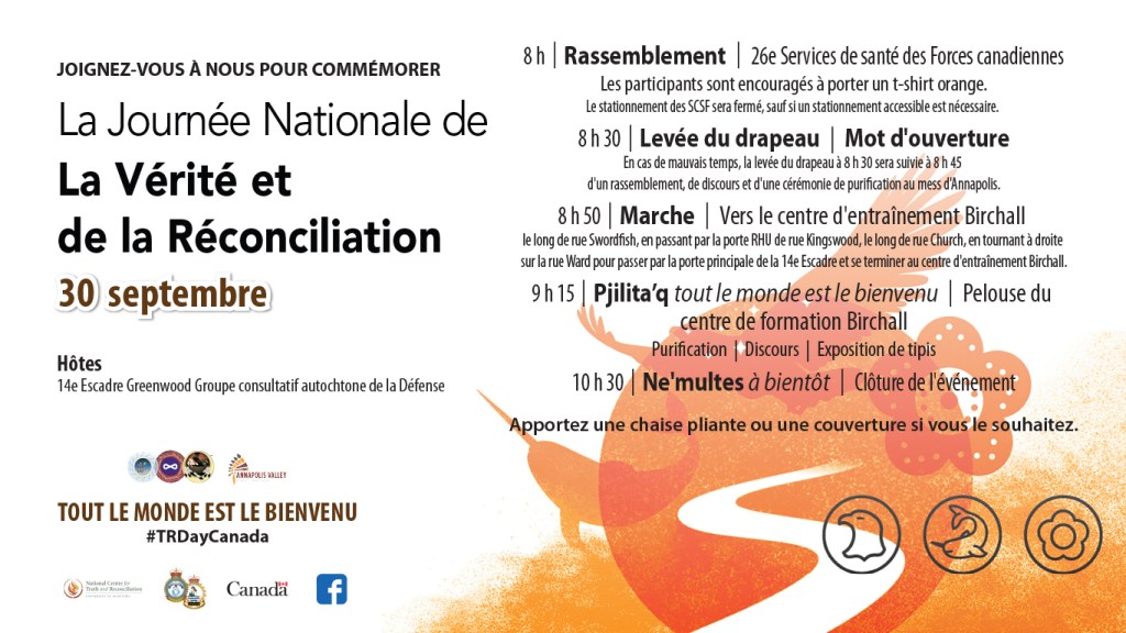 September 30, join the 14 Wing Greenwood Defence Indigenous Advisory Group and mark National Truth and Reconciliation Day. Everyone is welcome. Attendees are encouraged to wear an orange T-shirt.