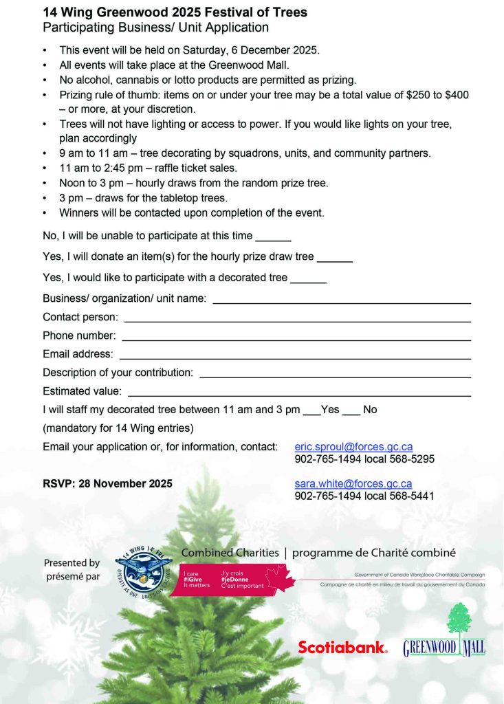 The Festival of Trees is the major campaign fundraising event, at which tabletop trees are decorated, adorned with gifts and raffled by ticket sales. Trees are decorated and donated by both units and squadrons at 14 Wing Greenwood and by interested local businesses and organizations. The event also features a random prize tree, with a selection of donated items raffled off in hourly draws. If you would like to enter a tree or donate a prize, contact Sara White, sara.white@forces.gc.ca.