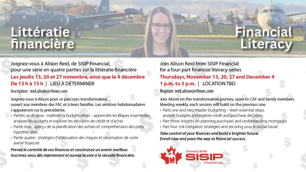 Greenwood SISIP financial counsellor Alison Reid will lead a four-part financial literacy series for CAF members and their families 1 p.m. to 3 p.m. Thursdays, November 13, 20 and 27; and December 4. Sessions will build on information and skill development, including budgeting, credit and purchase decisions, understanding mortgages, risk mitigation and securing your financial future.