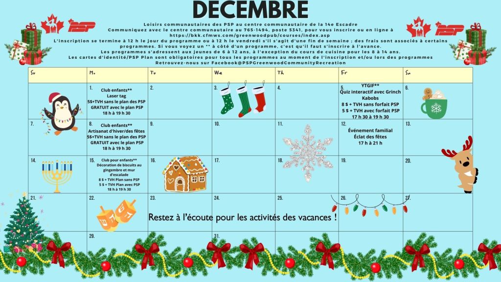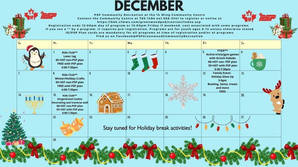 Holiday season youth fun is making its way onto the PSP Greenwood Community Recreation calendar. For PSP Community Recreation information, program registration (bkk.cfmws.com/greenwoodpub/account/index.asp) and PSP Plan membership, contact the Community Centre at 902-765-1494 local 568-5341. Most programs take place in the Community Centre, Building 110, Church Street, Greenwood.