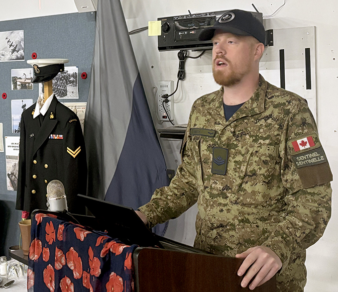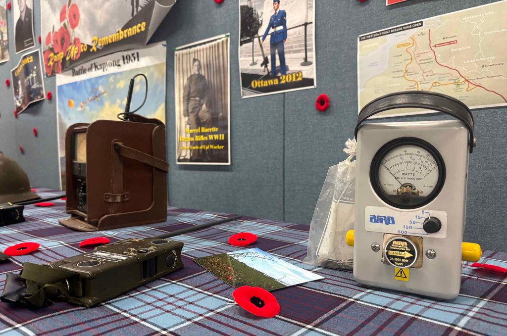 Personal mementos and gathered heritage on display in the middle of 4 Hangar’s workspace help members of 14 Wing Greenwood’s Communications and Information Systems Flight learn more about the reasons for Remembrance Day.