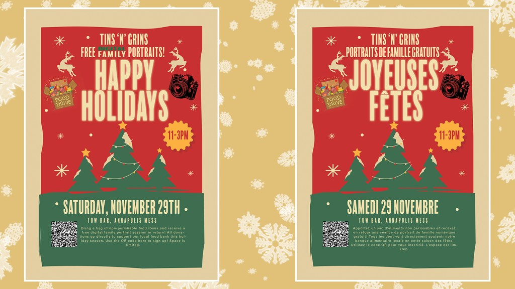 Saturday, November 29, between 11 a.m. and 3 p.m., 14 Wing Imaging volunteers will be set up at the Annapolis Mess for free family digital portraits. This “Tins ‘n Grins” event will help other families have a happier holiday, as the sitting “fee” is a bag of non-perishable food items for the Upper Room Food Bank in Kingston.