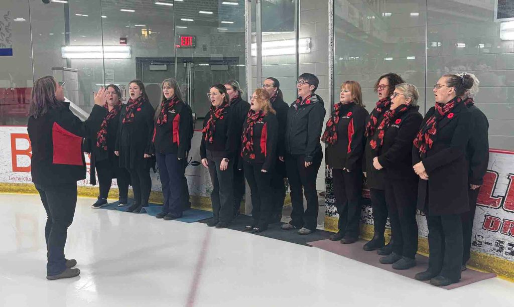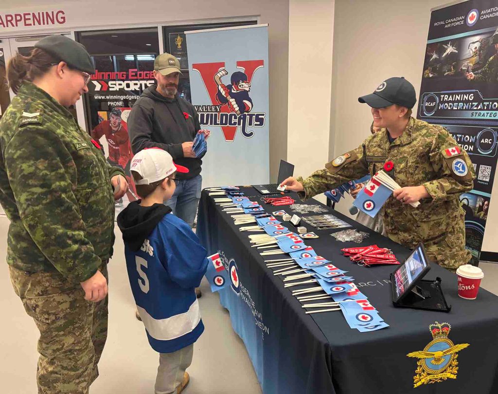 404 (Long Range Patrol and Training) Squadron Honorary-Colonel Judy Rafuse, doing her volunteer security role at the Wildcats’ home games, snags a pic with her 14 Wing Greenwood buds, Colonel Luc Vachon, right, and Wing Chief Warrant Officer Justin Harper. The Canadian Military Wives Choir Greenwood performed the national anthem from the ice for the Wildcats’ military appreciation game November 8.14 Wing Air Reserve recruiter Master Corporal Jenna Howe welcomed Valley Wildcats’ game attendees to check out some RCAF options – and swag!Valley Wildcats’ mascoat Roary gets a pic with 14 Wing Greenwood Colonel Luc Vachon, right; Wing Chief Warrant Officer Justin Harper, second from left; and 5th Canadian Division Support Base Gagetown Detachment Aldershot Major David Andrews, right.Berwick’s Royal Canadian Legion Ortona Branch 069 officials and colour party led the military appreciation game formalities November 8.14 Wing Greenwood Colonel Luc Vachon, left, with Wing Chief Warrant Officer Justin Harper, second from right; were joined by 5th Canadian Division Support Base Gagetown Detachment Aldershot Major David Andrews, left; and Royal Canadian Legion Ortona Branch 0069 Berwick president Sue Goddard for the official puck drop, as the Valley Wildcats and the Grand Falls Rapids took to the Wildcats’ home ice November 8.