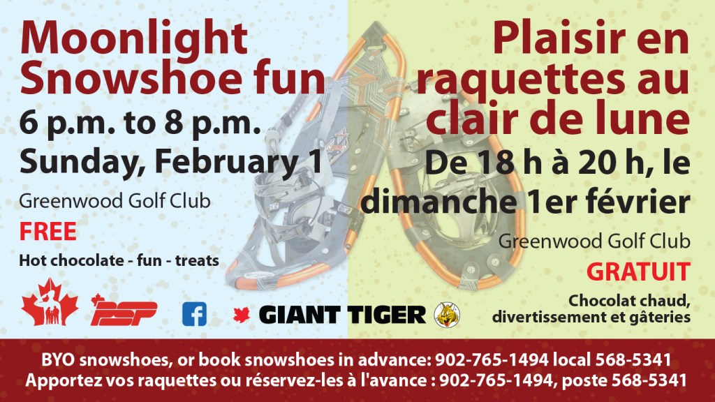 Sunday evening, February 1, between 6 p.m. and 8 p.m., join friends at the Greenwood Golf Course for a free full moon snowshoe activity, with hot chocolate and treats. Bring your own snowshoes, or book in advance with 14 Wing Greenwood Community Recreation, at 902-765-1494 local 568-5341. Sponsored in part by Giant Tiger Greenwood.