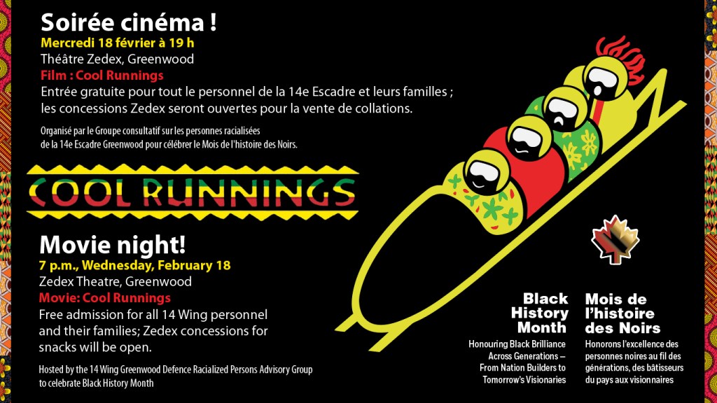 Wednesday, February 18, at 7 p.m., the 14 Wing Greenwood Defence Racialized Persons Advisory Group will host a screening of “Cool Runnings” at the Zedex Theatre, Greenwood, to celebrate Black History Month. Admission is free for all 14 Wing personnel and their families; Zedex concessions for snacks will be open.