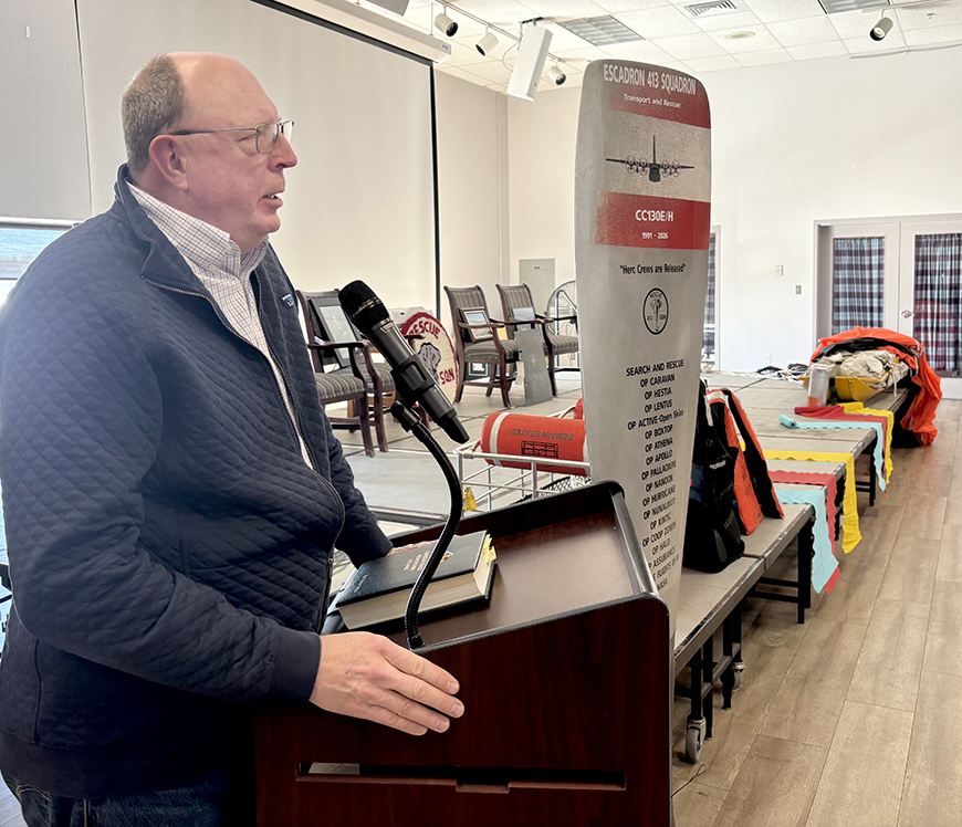 Culver thanked everyone for attending the Herc Farewell event, but acknowledged the absence of many 413 Squadron members: “SAR goes on.”