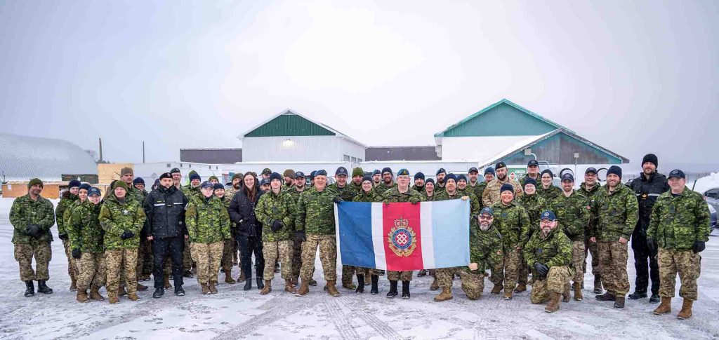 Military and civilian personnel who work in supply chain management, transportation, human resource management, finance, food services, postal and ammunition trades bundled up for a -11 degrees Celsius, early morning, breezy flag-raising outside 2 Hangar.