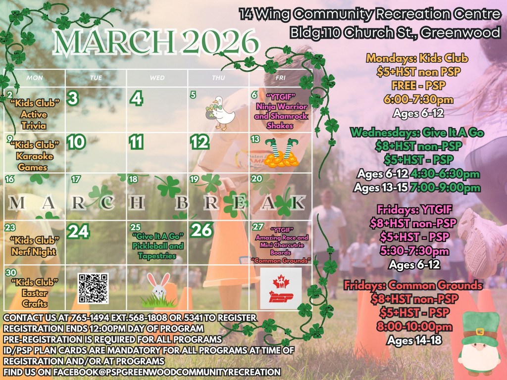 Check out 14 Wing Greenwood’s March calendar of events, including new youth activities like Give It A Go and Common Grounds and the classic Kid’s Club and Youth Thank Goodness It’s Friday (TGIF) sessions.