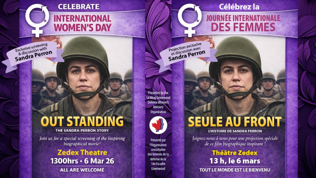 At 1 p.m., Defence Team members and friends are welcome to attend a free screening of the Sandra Perron biographical film, “Out Standing,” in the Birchall Theatre, with Perron herself as special guest speaker.